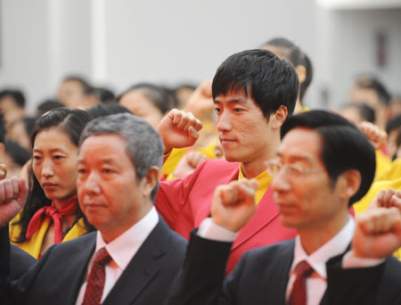 Liu Xiang (C), 110-meter hurdler, and other top athletes and sports officials pledge to 'play with honour' at the ceremony on the formation of the Chinese delegation to the Beijing Olympic Games in Beijing July 25, 2008. The 1,099-member delegation includes 639 athletes for the Games, which is to open on August 8. [Xinhua]