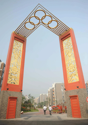 People walk through a Chinese-style gate in front of the athletes' apartment buildings in the Olympic Village in Beijing, July 23, 2008. As the Games approaches, the Olympic Village is ready for its official opening on July 27. [Xinhua]
