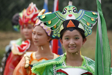 Performers are dressed up as the Olympic mascots during a rehearsal of a show featuring the mascots in Beijing July 25, 2008. The show is one of the Olympic themed cultural activities and will be performed in the Olympic Green. [Agencies]