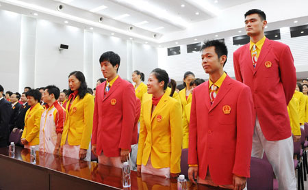 Yao Ming (R), China's national men's basketball team center, and other top athletes attend the ceremony on the formation of the Chinese delegation to the Beijing Olympic Games in Beijing July 25, 2008. The 1,099-member delegation includes 639 athletes for the Games, which is to open on August 8. [Xinhua]