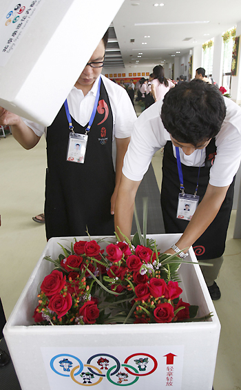 Volunteers arrange flowers which will be presented to medal winners at the Beijing Olympics, at the Olympic flower distribution center in Beijing July 25, 2008.[Agencies]