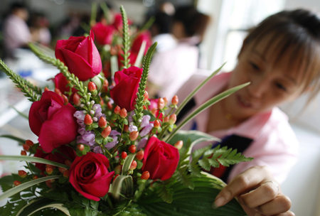 A volunteer practices how to arrange flowers which will be presented to medal winners at the Beijing Olympics, at the Olympic flower distribution center in Beijing July 25, 2008.[Agencies]