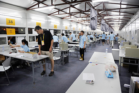 Members of Olympic ticket sales staff work at a ticket office in Beijing, July 26, 2008. Tickets for events held in venues in and around the Olympic Green have been sold out in the morning, on July 26, 2008. [Xinhua]
