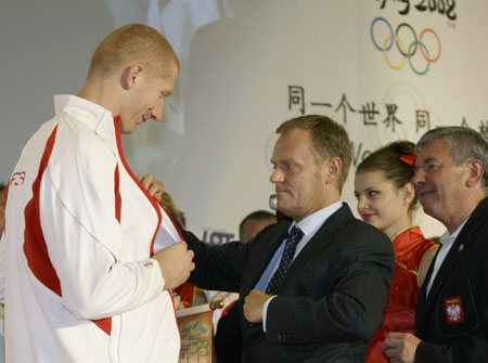 Polish Prime Minister Donald Tusk (C) presents Hand Ball player Karol Bielecki with Olympic nomination at Poland's Olympics headquarters in Warsaw July 25, 2008. [Agencies]