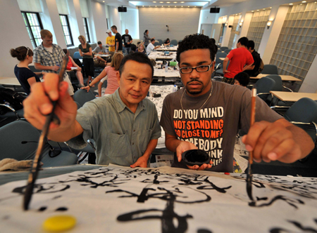 An overseas Olympic volunteer (R) learns Chinese calligraphy from Gao Yuan, a Chinese calligraphy teacher, in Beijing, June 24, 2008. Twenty-four students from the University of Iowa in the United States, who will serve as Olympic media volunteers in August, started their week-long orientation course on Chinese culture, environment, economy, media and ethnic minorities at Tsinghua University as of Monday. [Xinhua]