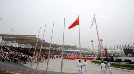 Chinese delegation holds first flag-raising ceremony at Olympic Village July 27, 2008. The Olympic Village was officially opened on Sunday and Chinese sports delegation entered the village. [Xinhua]