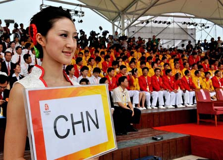Members of the Chinese delegation attend the first flag raising ceremony of the delegation at the Olympic Village July 27, 2008. [Xinhua] Click for more photos