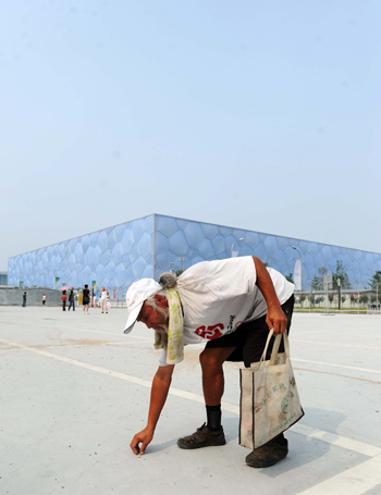 Chen Guanming, a farmer from Xuzhou of East China's Jiangsu Province picks up a cigarette end in front of the National Aquatics Center, or Water Cube July 26, 2008. Chen traveled from his hometown to Beijing on his self-made tricycle while promoting the concept of "Green Olympics" all the way. [Xinhua]