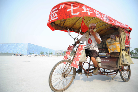 Chen Guanming, a farmer from Xuzhou of East China's Jiangsu Province poses with his self-made tricycle in front of the National Aquatics Center, or Water Cube July 26, 2008. Chen traveled from his hometown to Beijing on tricycle while promoting the concept of "Green Olympics" all the way. [Xinhua]
