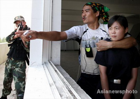 A "terrorist" holds the "hostage" in an anti-terrorist drill in Huaibei of Anhui province on July 27, 2008. About 100 troops made up of local policemen, special forces agents and firefighters took part in this joint exercise to ensure a safe Olympics. [Asianewsphoto]