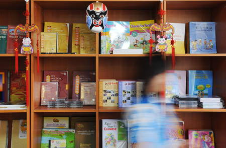 A volunteer walks pass a bookshelf at the Chinese Learning Area in the Olympic Village in Beijing, July 27, 2008. The Chinese Learning Area will provide a platform for athletes from all over the world to learn the Chinese language, as well as basics about Chinese calligraphy and other aspects of traditional culture. [Xinhua]