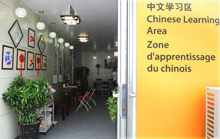 Photo taken on July 27, 2008 shows the Chinese Learning Area at the Olympic Village in Beijing, July 27, 2008. The Chinese Learning Area will provide a platform for athletes from all over the world to learn the Chinese language, as well as basics about Chinese calligraphy and other aspects of traditional culture. [Xinhua]