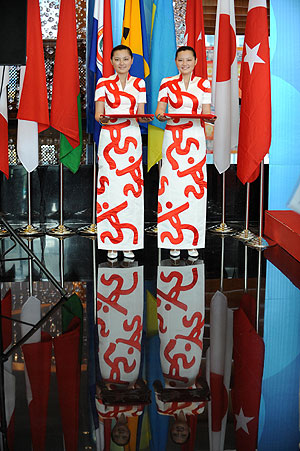 Two Olympic hostesses, dressed in traditional Chinese costume or Qipao, pose in the International Zone at the Qingdao Olympic Village, July 28, 2008. The Qingdao Olympic Village was officially opened on July 27, 2008, and is full of Chinese elements. [Xinhua]