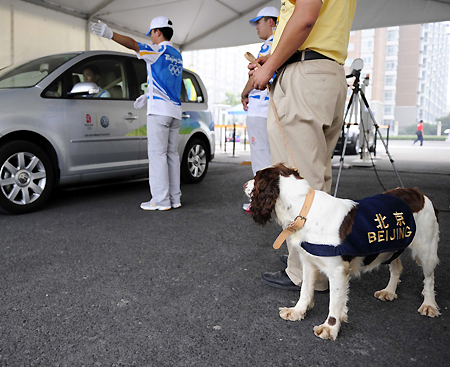A sniffer dog watches a car passing by an entrance of the Olympic Village in Beijing, July 27, 2008. A total of 204 trained dogs will be used to detect suspicious goods in competition venues, training areas and Olympic-related hospitals and hotels in order to ensure safety during the Olympic and Paralympic Games. [Xinhua]