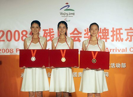 Paralympic hostesses hold the gold, silver and bronze medals (from L to R) that will hang around the necks of winning athletes at September's Paralympics in Beijing, July 28, 2008. [Xinhua]