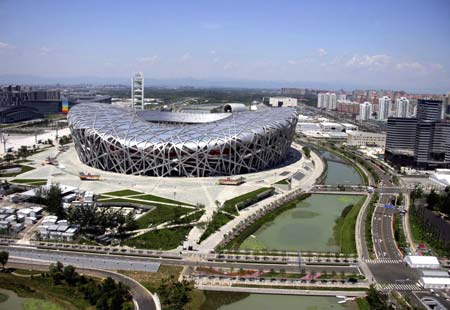 An aerial view shows the National Stadium, also known as the Bird's Nest, at the Olympic Green in Beijing July 6, 2008.[Agencies]