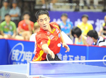 Chine's Olympic delegation member Wang Liqin returns a shot to teammate Wang Jianjun during a warm-up game July 28, 2008. China's table tennis squad Wang hao, Ma Lin and Wang Liqin beat teammates Chen Qi, Ma Long and Wang Jianjun 3-2 in a warm-up team game. [Xinhua]