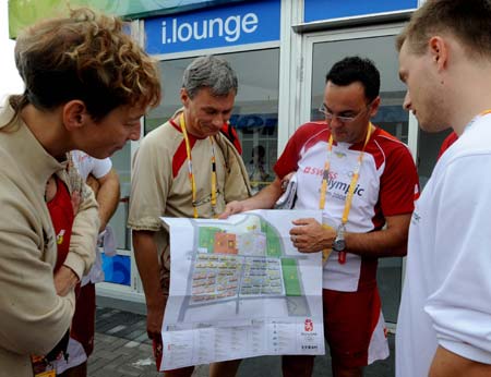 Athletes from Switzerland look at a map at the Beijing Olympic Village, July 29, 2008. The Olympic Village, which was officially opened on Sunday, will accommodate more than 16,000 athletes and officials from over 200 countries and regions. [Xinhua]