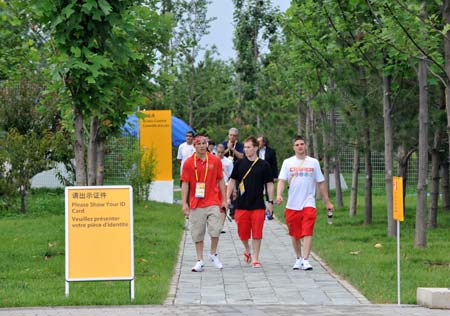 Canadian athletes walk in the Beijing Olympic Village, July 29, 2008. The Olympic Village, which was officially opened on Sunday, will accommodate more than 16,000 athletes and officials from over 200 countries and regions. [Xinhua]