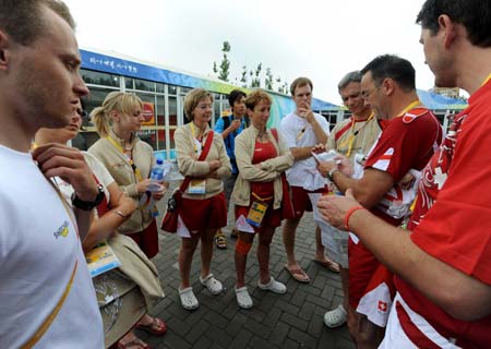 Athletes from Switzerland chat in the Beijing Olympic Village, July 29, 2008. The Olympic Village, which was officially opened on Sunday, will accommodate more than 16,000 athletes and officials from over 200 countries and regions. [Xinhua]