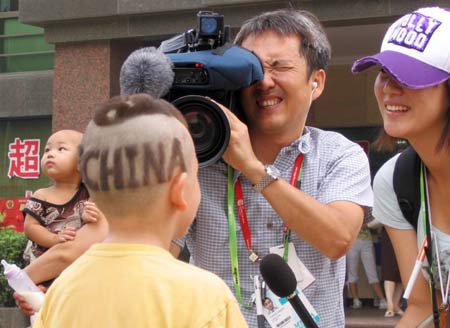 A cameraman takes footage as a boy with a Beijing Olympic logo haircut poses in Beijing, China, July 28, 2008. Local barber Wu Dasheng offered the boys in his neighborhood free Olympic-themed haircut to cheer for the upcoming Beijing Olympic Games.[Xinhua]