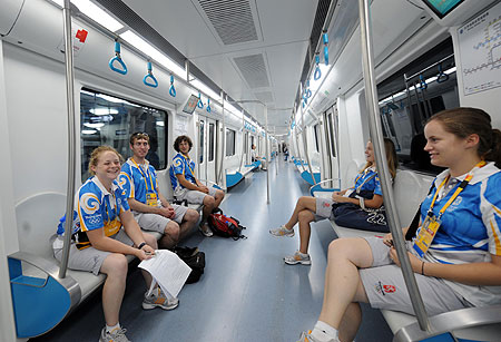 Olympic volunteers from America ride the Olympic Branch Line or Subway Line 8, July 28, 2008. With four stops (at Forest Park South Gate, Olympic Park, Olympic Sports Center and Beitucheng), the Olympic Extension stretches 4.5 kilometers through the northern part of Beijing. [Xinhua]