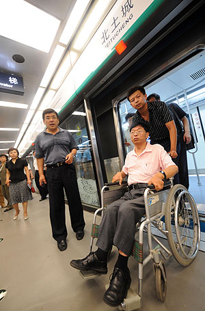 Passengers test the barrier-free services of the Olympic Branch Line, or Subway Line 8 July 28, 2008. With four stations, namely, Forest Park South Gate, Olympic Park, Olympic Sports Center and Beitucheng), the line is 4.5 kilometers long stretching through the northern part of Beijing. [Xinhua]