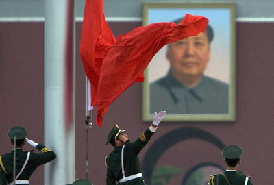 A paramilitary policeman raises the Chinese national flag in front of the portrait of late Chinese leader Mao Zedong at Tiananmen Square in Beijing July 30, 2008. [Agencies]