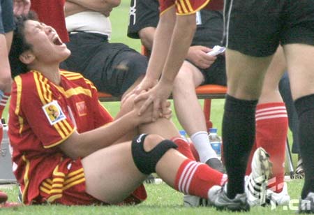 Chinese star striker Ma Xiaoxu reacts after she was injured in an soccer warm-up against the United States in Qinhuangdao, North China's Hebei Province, July 30, 2008. [sina.com]