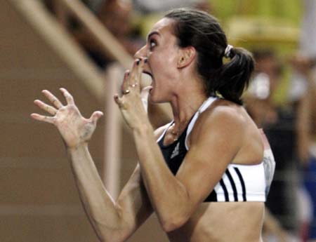 Russia's Yelena Isinbayeva reacts after breaking her own women's world pole vault record after she cleared 5.04 metres at her third attempt at the Monaco grand prix in Monte-Carlo July 29, 2008. [Agencies]