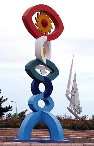 Photo taken on July 30, 2008 shows a sculpture at the Olympic co-host city Qingdao, east China. The sailing events for the Games of the XXIX Olympiad will be held within Qingdao International Sailing Center, the five water areas outside Fushan Bay. A unique blend of sea and mountains makes Qingdao a well-known summer resort. With an average temperature ranging from 20-28 degrees celsius, the period from July through September is the most agreeable season for the tour.[Xinhua]
