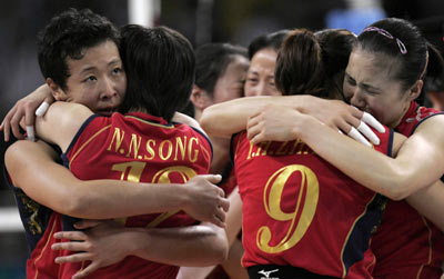 Members of Chinese women's volleyball team celebrate after bagging gold at Athens Olympic Games in this July 31, 2008 file photo. [Xinhua]