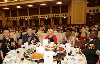 A reception is held by the Denfense Ministry of China to celebrate the 81st Army Day which will fall on August 1, 2008 in Beijing, China, on July 31, 2008. Military officers of Foreign Embassies in China and their wives also attend the reception. [Xinhua]