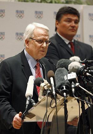 Head of the French National Olympic Committee Henri Serandour (L) hold a news conference in Paris April 15, 2008. Serandour has ruled out allowing his athletes to wear the badge at the Beijing Games that reads 'For a Better World'. [Agencies]