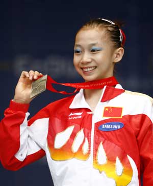 The file photo taken on September 8, 2007 shows 16-year old Yang Yilin of the Chinese Gymnastics Team smiles after winning the bronze medal in the women's uneven bars at the 2007 Stuttgart World Gymnastics Championships in Stuttgart of Germany. China will send its biggest-ever Olympic team of 639 athletes to compete on home soil next month. [Xinhua]