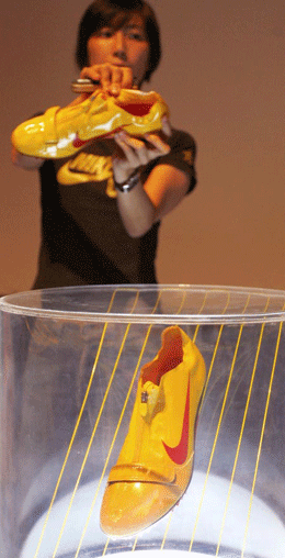 A model presents the running shoes Chinese 110m hurdler Liu Xiang will wear during the Beijing Olympic Games, in Beijing, July 31, 2008. Liu's running shoes and jersey were unveiled on Thursday. [Xinhua]