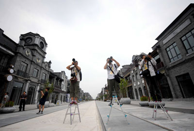 Foreign journalists try a balancing act to photograph the new Qianmen Street in Beijing July 31, 2008. [Xinhua]
