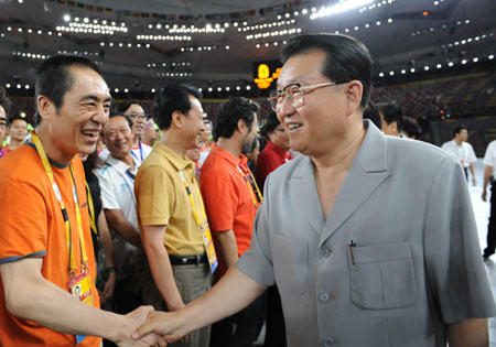 Li Changchun (R), member of the Standing Committee of the Communist Party of China (CPC) Central Committee Political Bureau, shakes hands with the Games opening ceremony artistic director Zhang Yimou after a rehearsal of the opening ceremony, August 2, 2008. [Xinhua]