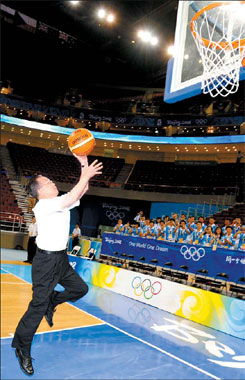 Premier Wen Jiabao shoots a hoop at the Beijing Olympic Basketball Gymnasium, where he met with the Chinese men's team August 3, 2008. He talked to NBA star Yao Ming, and wished the team the best for the Games. [Xinhua]