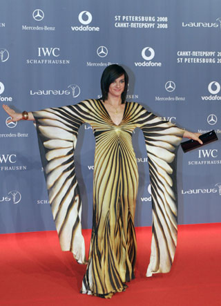 Russian pole vaulter Yelena Isinbayeva arrives for the Laureus awards ceremony in the Mariinsky Theatre in St Petersburg February 18, 2008. [Agencies]