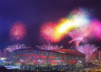 Fireworks explode over the National Stadium during the second full dress rehearsal of the opening ceremony of Beijing 2008 Olympic Games in Beijing, capital of China, Aug. 2, 2008.