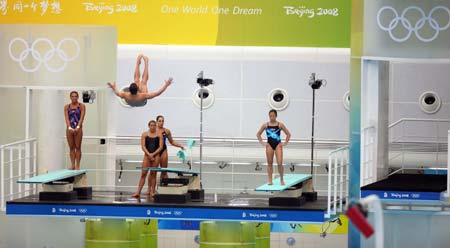 The American diving team trains on spring boards at the