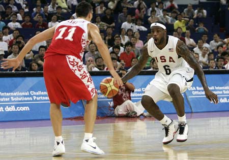 LeBron James (R) of the United States dribbles as Zakhar Pashutin of Russia guards him during a friendly basketball game as part of their Olympic training in Shanghai, a co-host city for the Beijing Olympic Games, on August 3, 2008. [Agencies]