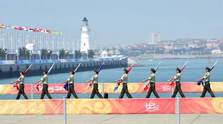 Chinese soldiers, who will be flag raisers during the Beijing Olympic Games in Qingdao division, march beside the sea in co-host city Qingdao. The Olympic sailing competition award ceremony will be held on the sea for the first time in Olympic history. [Xinhua]