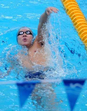 Korean swimmer ParkTae Hwan swims backstroke at the National Aquatic Center, also known as the "Water Cube," on August 3, 2008. This is the first time the Melbourne Swimming Championships 400m freestyle winner has trained at the Olympic swimming venue to prepare for the Games. [Xinhua]