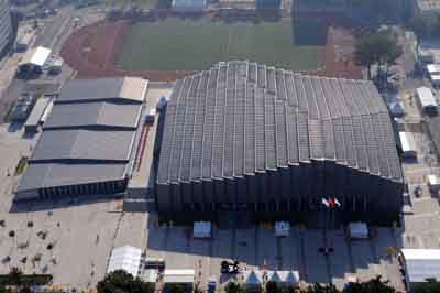 An aerial view of the China Agricultural University Gymnasium, which will hold the wrestling competitions, in this picture taken on August 2, 2008. [Xinhua]