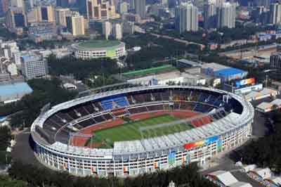An aerial view of the Beijing Workers' Stadium in this picture taken on August 2, 2008. Located on the Gongti Rd.,in Beijing's Chaoyang District, it will hold the football events. [Xinhua]