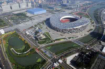 An aerial view of the National Stadium, also known as the Bird's Nest, in this picture taken on August 2, 2008. Located on the Olympic Green, it will hold the competitions of Athletics and Men's Football Finals. [Xinhua]