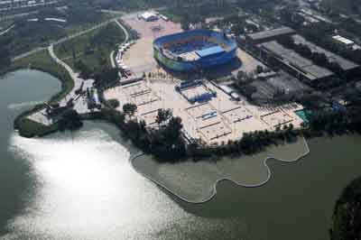 An aerial view of the Chaoyang Park Beach Volleyball Ground in Beijing's Chaoyang District, in this picture taken on August 2, 2008. [Xinhua]