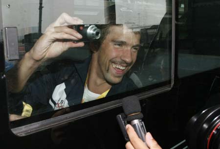 Michael Phelps of the U.S. national swimming team takes pictures of photographers as he arrives at Beijing airport to participate in the Beijing 2008 Olympic Games, August 4, 2008. [Agencies]